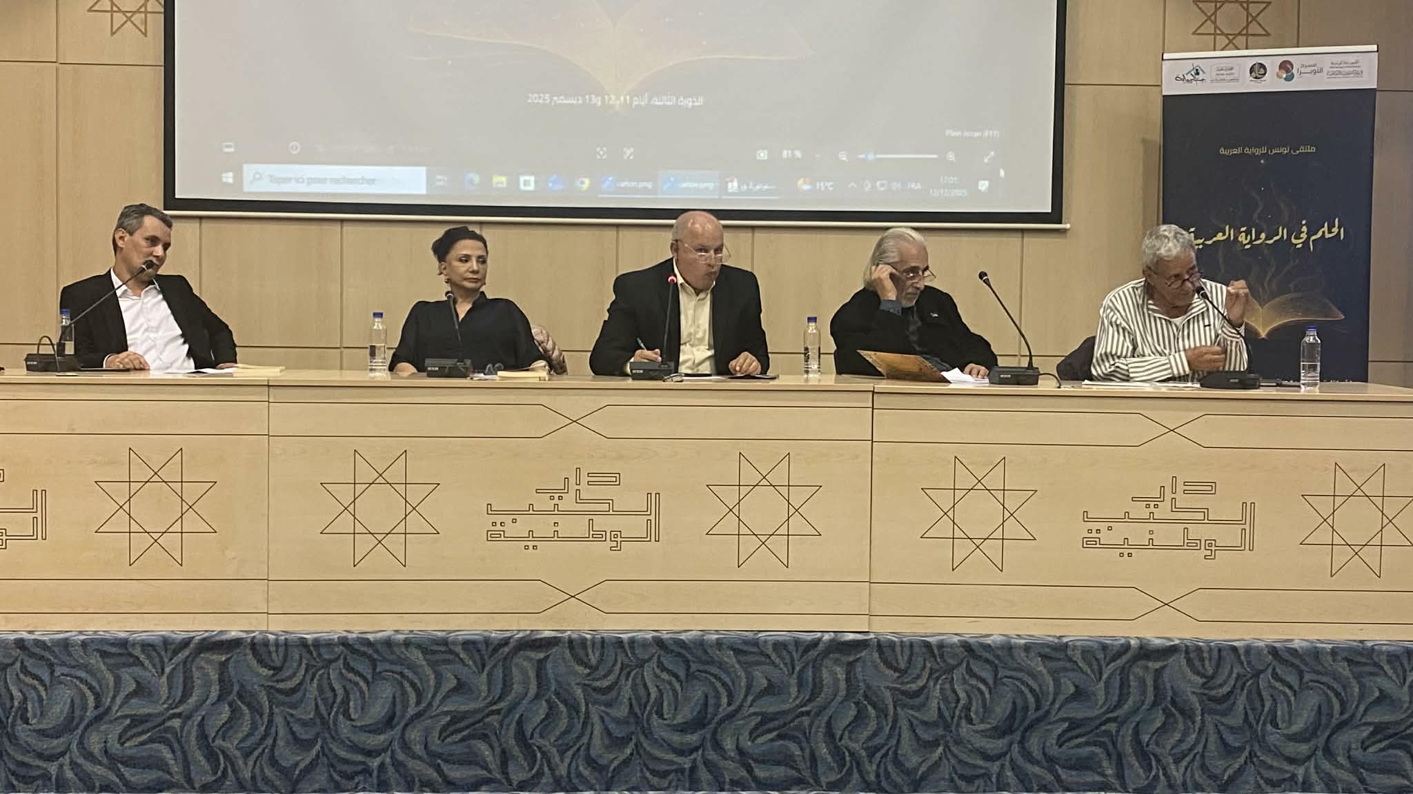 شهد اليوم الختامي تنظيم جلسة أدبية خامسة على الساعة العاشرة صباحا بدار الكتب الوطنية تناولت محور “الحلم في الرواية العربيّة” نماذج من الرّواية العربيّة أدار الجلسة الأستاذ مصطفى الكيلاني من تونس وقدّم خلالها ورقة بحثية بعنوان: “المُبْهَم الشبَحِيّ في النفس: واقعا وحياة في رواية البحث عن وليد مسعود لجبرا إبراهيم جبرا” تناول فيها أبعاد الحلم ودلالاته النفسية في هذا العمل الروائي البارز.
