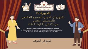 افادنا السيد فتحي حمدي مدير المركز الثقافي الجامعي بالمنستير ان الدورة 19 للمهرجان الدولي للمسرح الجامعي ستكون من 5 الى 13 اوت 2023 بمشاركة 15 دولة هي تونس وايطاليا وفرنسا وبلغاريا وروسيا والصين والسعودية والمغرب وفلسطين ومصر والعراق وسلطنة عمان فالجزائر وسوريا والاردن وقد اتخذت كل الاستعدادات لتكون دورة استثنائية على كل الاصعدة..هذا المهرجان سيكون تحت اشراف وزارة التعليم العالي والبحث العلمي وديوان الخدمات الجامعية للوسط والادارة الجهوية للخدمات الجامعية بالمنستير.