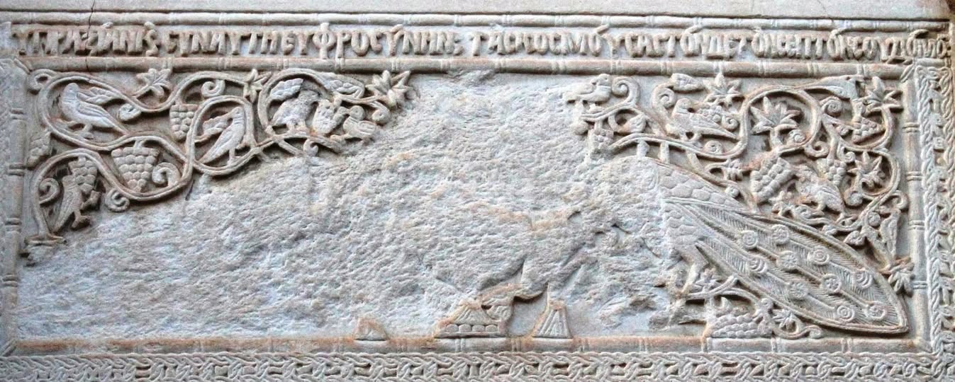 لا تدع الزخارف البارزة المصاحبة للنقش مجالاً للشك في أصله. فهي تُظهر مجموعةً نموذجيةً من الرموز البيزنطية والمسيحية المبكرة: أغصان عنب مثقلة، وطواويس وطيور جاثمة بين أوراق الشجر المتشابكة، وحيوان ضخم – يُحتمل أن يكون أسدًا – متربعًا على عرشه في وسط العمل الفني، وإطار عريض مضفر على شكل سجادة في الأسفل. تتكرر هذه العناصر في زخرفة الكنائس المسيحية في شمال إفريقيا بين القرنين الرابع والسابع الميلاديين. كانت الكرمة ترمز إلى القربان المقدس، والطاووس إلى خلود الروح، والأسد إلى القوة الإلهية. ولا شك أن هذا الحجر كان عنصرًا معماريًا في كنيسة أو مبنى مدني ذي أهمية بالغة خلال العصر البيزنطي.
