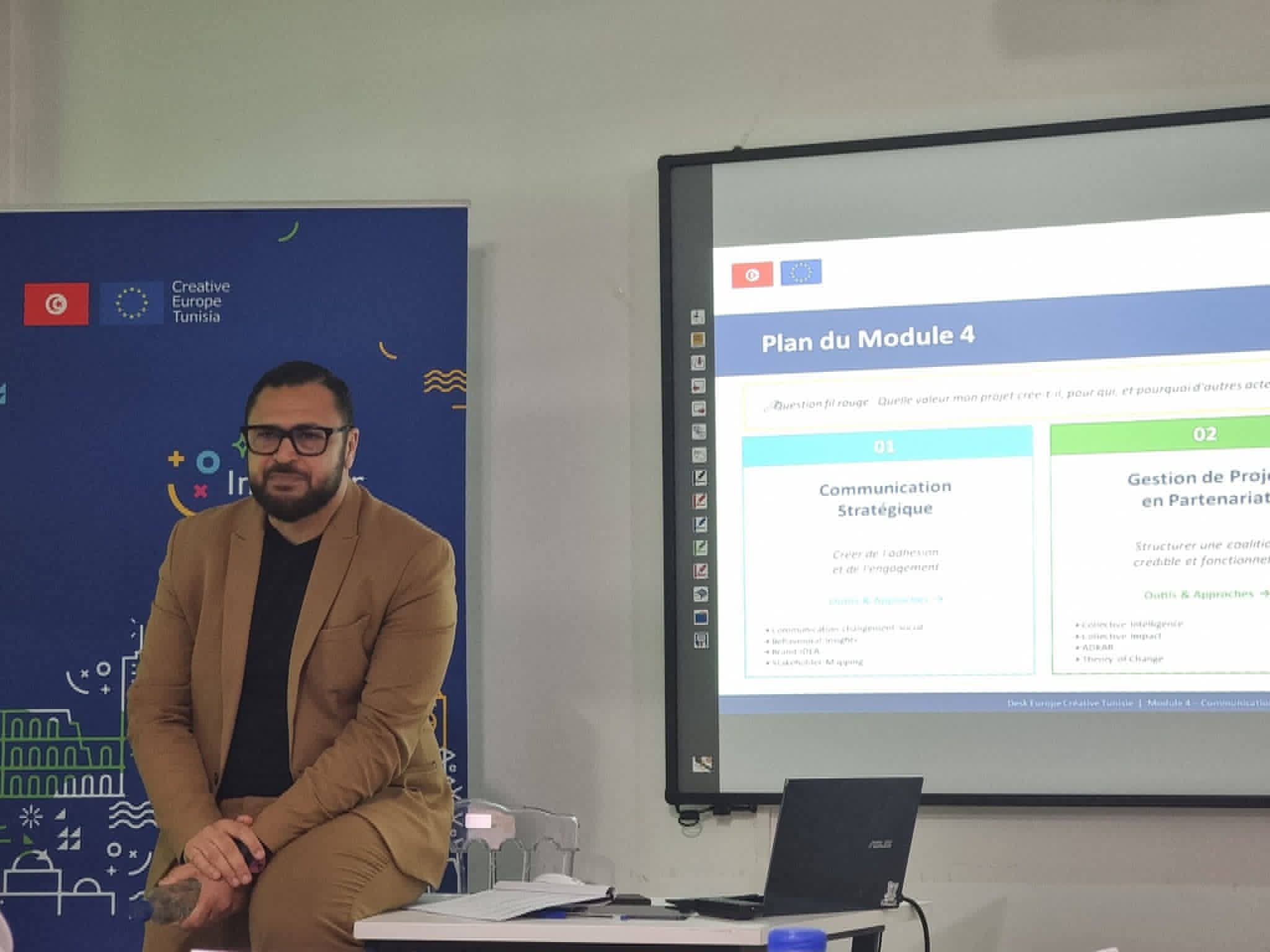 للنقاش المفتوح بين المشاركين حول الإبداع الثقافي،التعاون، التنقل، الإنتاج المشترك،الابتكار،الإبداع التشاركي،الإدماج،التداول،شبكة الشراكة،القيمة المضافة الأوروبية،التداول،الترسيخ الإقليمي وحول آليات تطوير المشاريع وتحويل الفكرة إلى مشروع أوروبي الى جانب تطوير مهاراتهم في هيكلة مشروع تعاون ثقافي وفقًا لمنطق التدخل المستخدم في التمويل الأوروبي، من خلال الجمع بين تحليل المشكلة، وبناء إطار منطقي، ودمج أولويات برنامج أوروبا الإبداعية وبما يهدف الى فهم منطق التدخل في المشاريع الممولة من جهات مانحة أوروبية، والتمييز بوضوح بين المشكلة، والحاجة، والهدف، والحل من خلال تكييف الفكرة ضمن مشروع حقيقي عبر صياغة أهداف ذكية (SMART) وادماج أولويات برنامج أوروبا الإبداعية الشاملة في منطق المشروع ورسم خرائط جماعية لتحديات ونقاط قوة الصناعات الثقافية والإبداعية التونسية ضمن مجموعات عمل تشاركية قادرة على خلق فرص حقيقية للصناعات الثقافية والإبداعية التونسية وضمن هيكل كامل قابل لإعادة الاستخدام للأوروبيين وتحويل فكرة إلى مشروع أوروبي والإتقان العملي لهيكلة مشروع تعاون ثقافي وفقًا لمنطق التدخل في التمويل الأوروبي. وبهدف تطوير مهارات عملية في بناء الميزانية ومعايير التقييم لمشاريع التعاون الأوروبي، قابلة للتطبيق خارج نطاق برنامج أوروبا الإبداعية، من خلال الجمع بين المعلومات السياقية والتمارين العملية القائمة على دراسة حالة افتراضية تم تمكين من المشاركين في الدورة من التعرّف على نموذج للمقاربة الاروبية الداعمة للمشاريع الثقافية من خلال عرض وتناول تجربة المركز الدولي للثقافة والتنمية او مدينة سارة بن حميدة الثقافية وفي ربط لكل مدخل نظري بنشاط عملي ليفضي هذا التكوين الى صياغة جماعية لدليل مرجعي لصيغ عرض مشروع ثقافي نموذجي بما ينطبق على جميع البرامج الأوروبية.